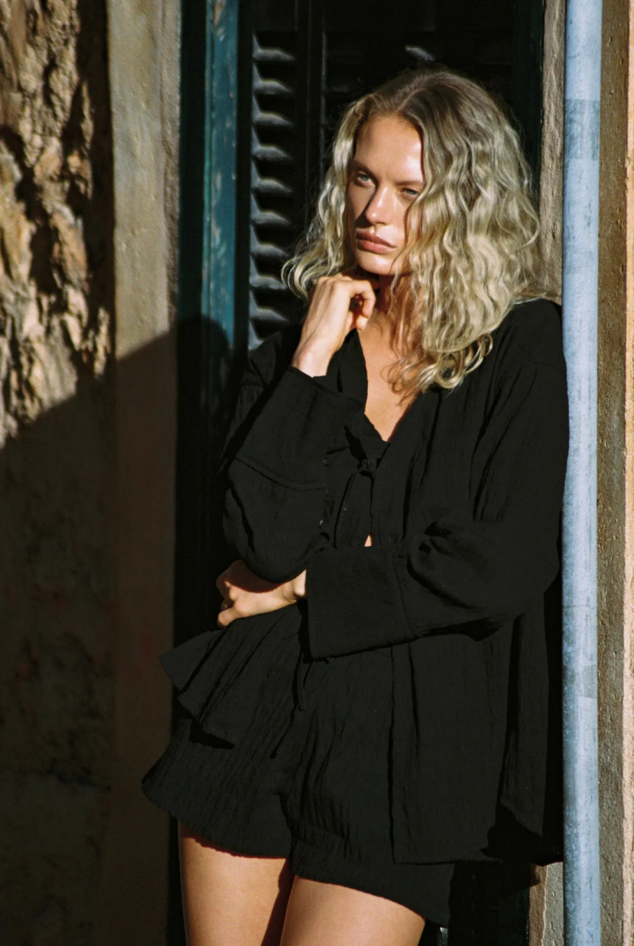 The Aimi Shirt offers both style and comfort, featuring a tie front detailing. Perfectly paired with the Aimi Pant for any occasion.