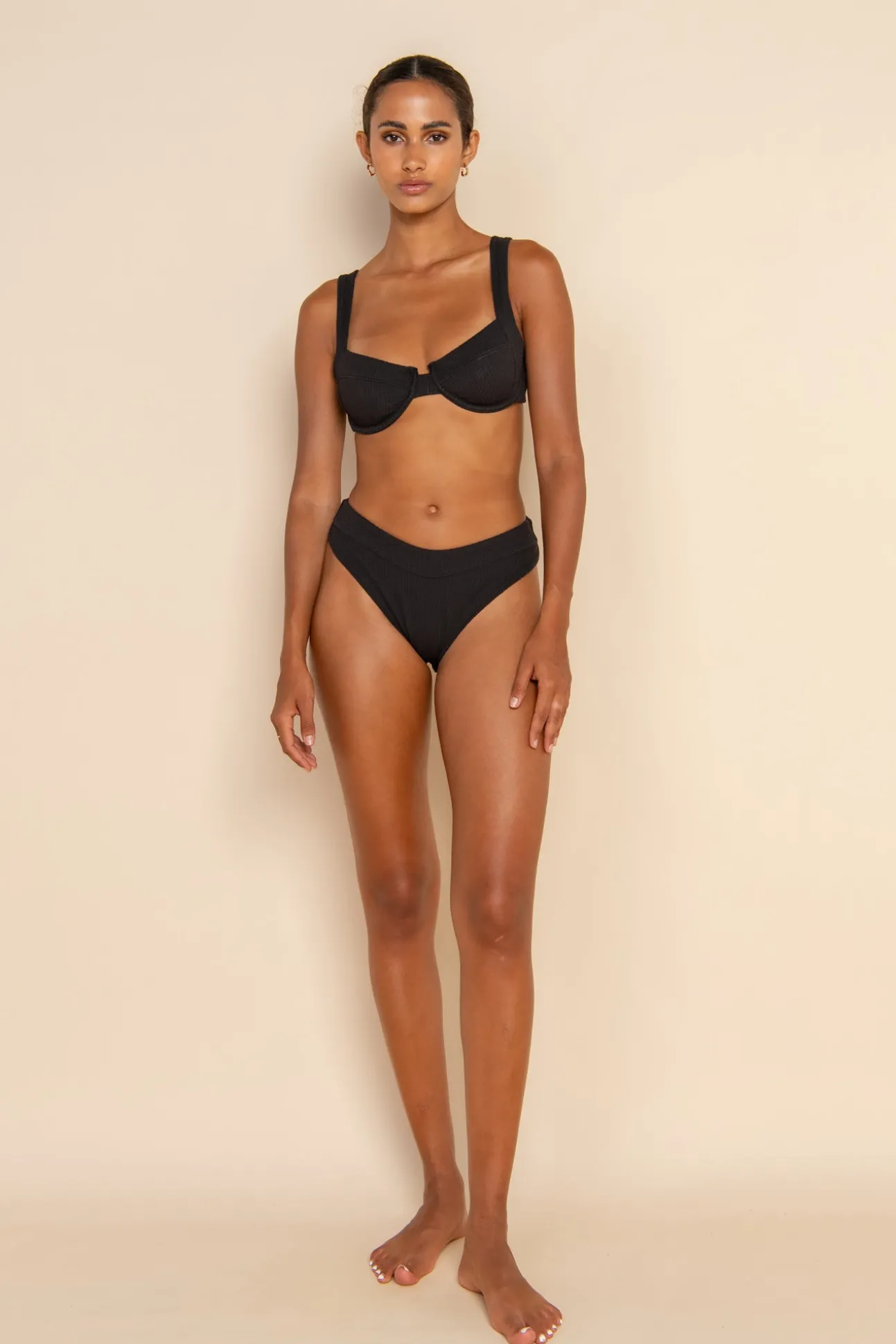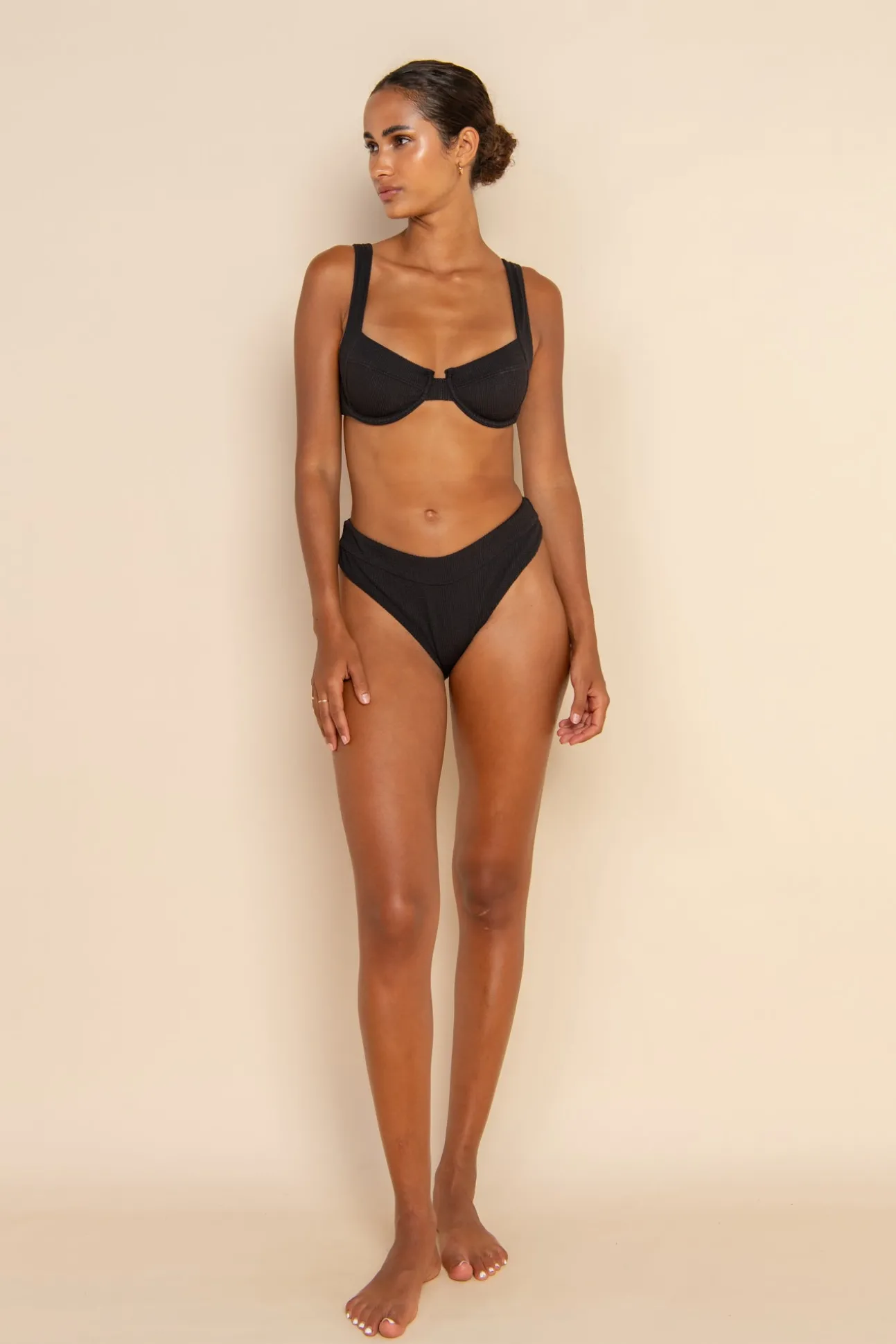 Our Indie Bottom is our mid rise style, offering mid-full coverage with a waistband feature designed to cinch through the waist. Pair with the Khlo or Naia Top in Black.