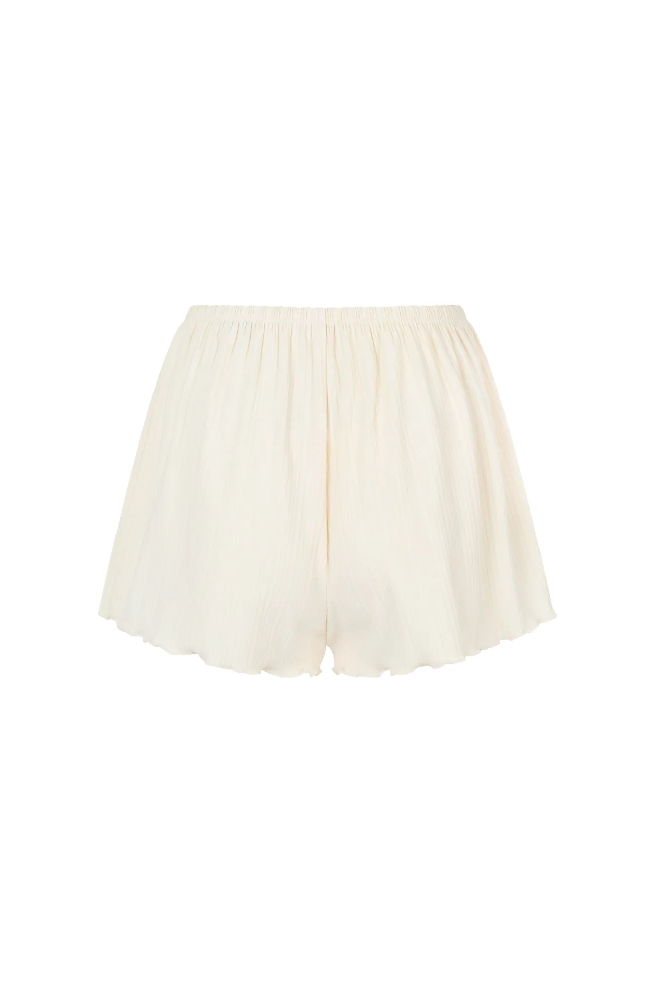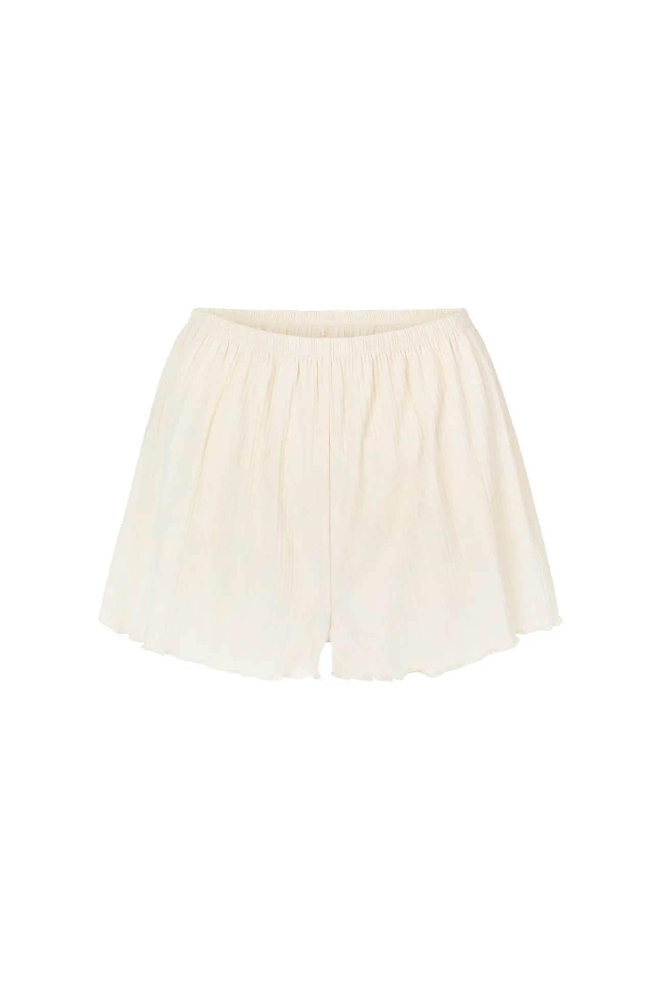 The Juni Short is crafted from soft micro-pleat fabrication with stretch, featuring a thin elasticated waistband with gathers for a comfortable fit. The mini flared design and lettuce edge hem adds a playful touch. Style with the Juni Tank for ultimate comfort.