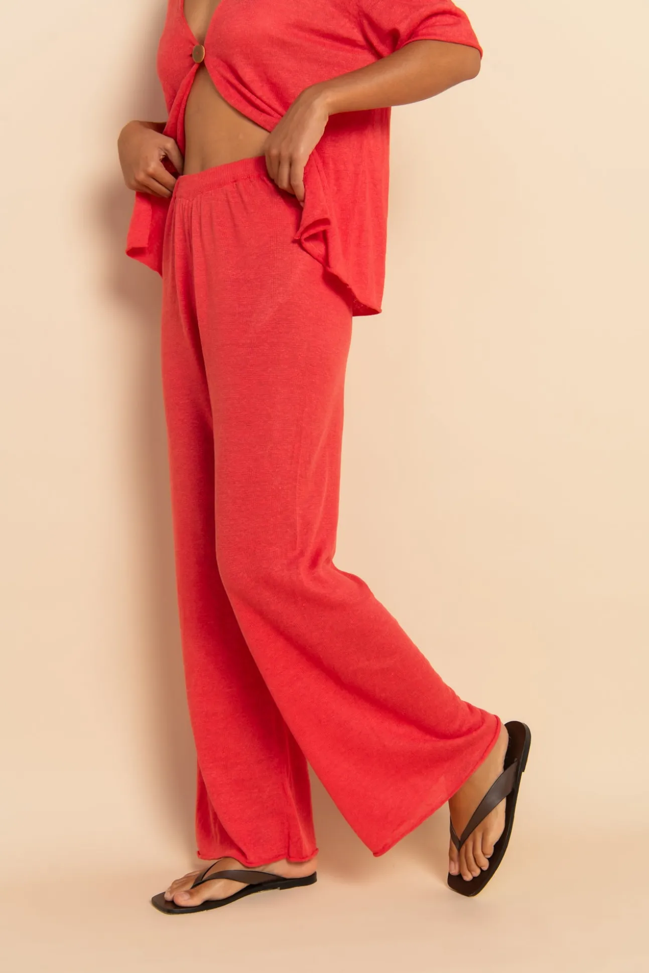 The Soraya Pant is crafted from 100% lightweight linen knit, offering a relaxed fit with a slightly sheer finish. Featuring an elasticated waistband with gathers for comfort, this full-length style has a straight leg and raw rolled hems. Style back with the Soraya top for an elevated loungewear look.